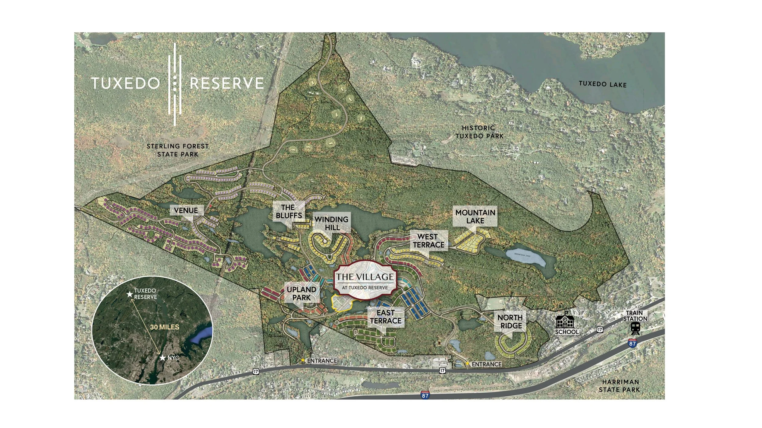 The Village at Tuxedo Reserve is the center of Tuxedo Reserve and will offer shops, restaurants, bars, services, over 330 luxury rental apartments, seasonal ice skating, and year round curated events, all developed by Related Companies.
